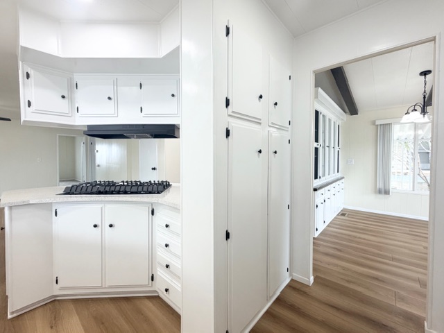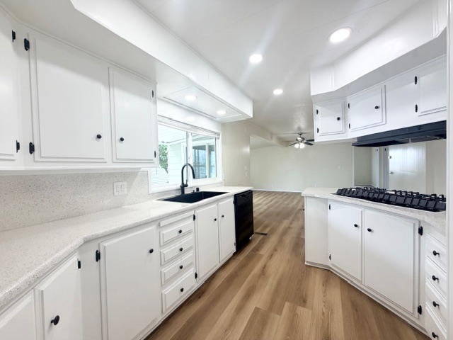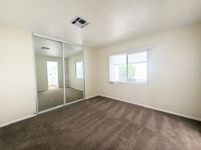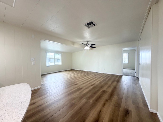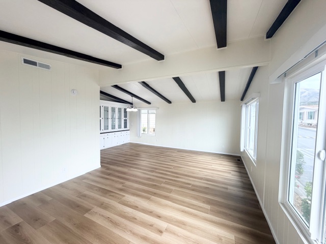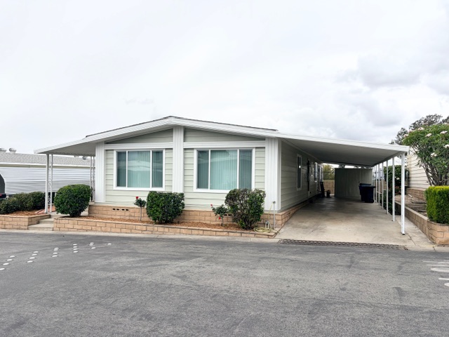 Spacious and like new!!! Welcome to Valencia Lea, Highland’s premier +55 community! This 2 bed 2 bath 1977 Goldenwest 1440sqft, plus bump-outs, home has great curb appeal, located on quite street with mature landscaping, featuring new paint, new dual pane windows and a large porch! This home features new interior paint, new lighting, ceiling fans, and new durable luxury vinyl plank flooring with carpeted bedrooms. The large beam-vaulted living and dining areas have plenty of windows, with new window coverings, letting in tons of natural light, and built-in dining room cabinets. The upgraded kitchen features updated counter tops, deep farm sink and new appliances! The kitchen is open to the family room with a huge bar peninsula, perfect for informal living. The guest bedroom has a large mirrored closet and nearby guest bathroom features tub shower combo. The large primary bedroom features a huge triple mirrored closet and attached spacious bathroom with glass enclosed low-threshold shower, double vanity, linen storage, garden tub and plenty of light! The full-length carport includes storage sheds. Don’t delay in taking a tour!